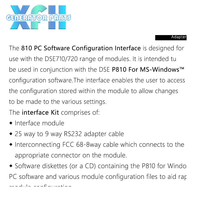 The 810 PC Software Configuration Interface is designed for use with the DSE5xx, DSE5xxx, DSE4200 and  DSE710/ 720 range of modules. It is intended to be used in conjunction with the DSE P810 For MS- Windows™
